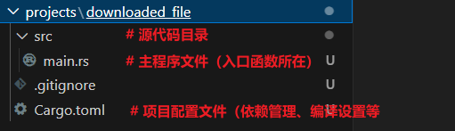 <font style="color:rgb(0, 0, 0);">cargo new 项目名</font>命令创建项目(项目名只能包含字母、数字、下划线,且不能以数字开头):