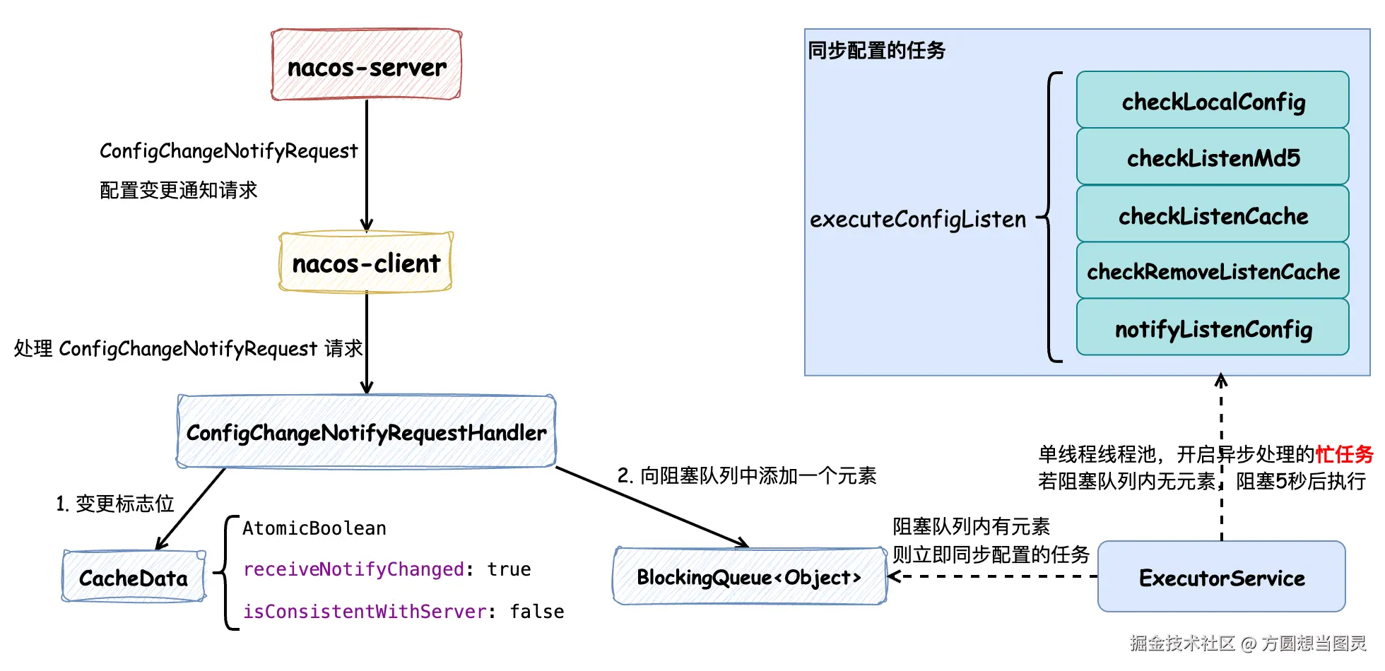 在 Nacos Client 启动时,它会执行 ConfigRpcTransportClient#initRpcClientHandler 方法来注册配置变更的处理器,这样在接收到服务端推送配置变更的请求时,会执行 ConfigRpcTransportClient#handleConfigChangeNotifyRequest 方法来处理请求,处理逻辑并不复杂,它会根据配置信息的唯一标识来查询配置信息的缓存数据,获取成功后会只是对缓存进行打标,而没有直接修改内存数据,并且向 BlockingQueue<Object> listenExecutebell 阻塞队列对象中添加了一个元素,随后处理服务端请求的流程就结束了,但是此时还并没有完成配置内容的变更: