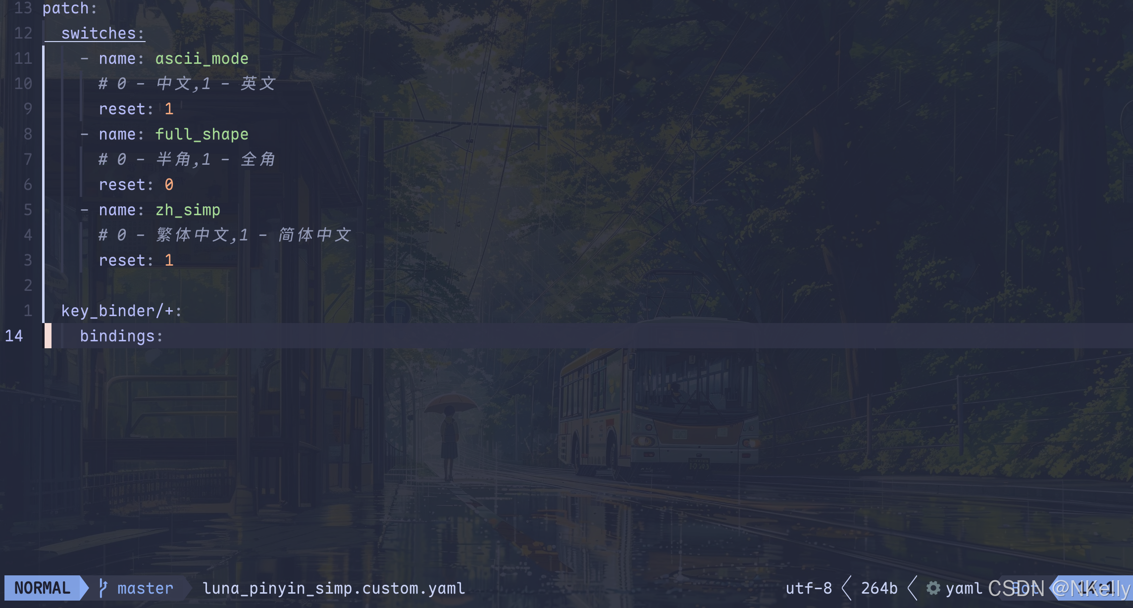 打开rime用户文件夹下的default.custom.yaml文件,这是rime的用户全局配置文件,只需要在patch下添加4行配置,即可以最优雅的方式解决neovim等模态编辑器中的输入法问题。