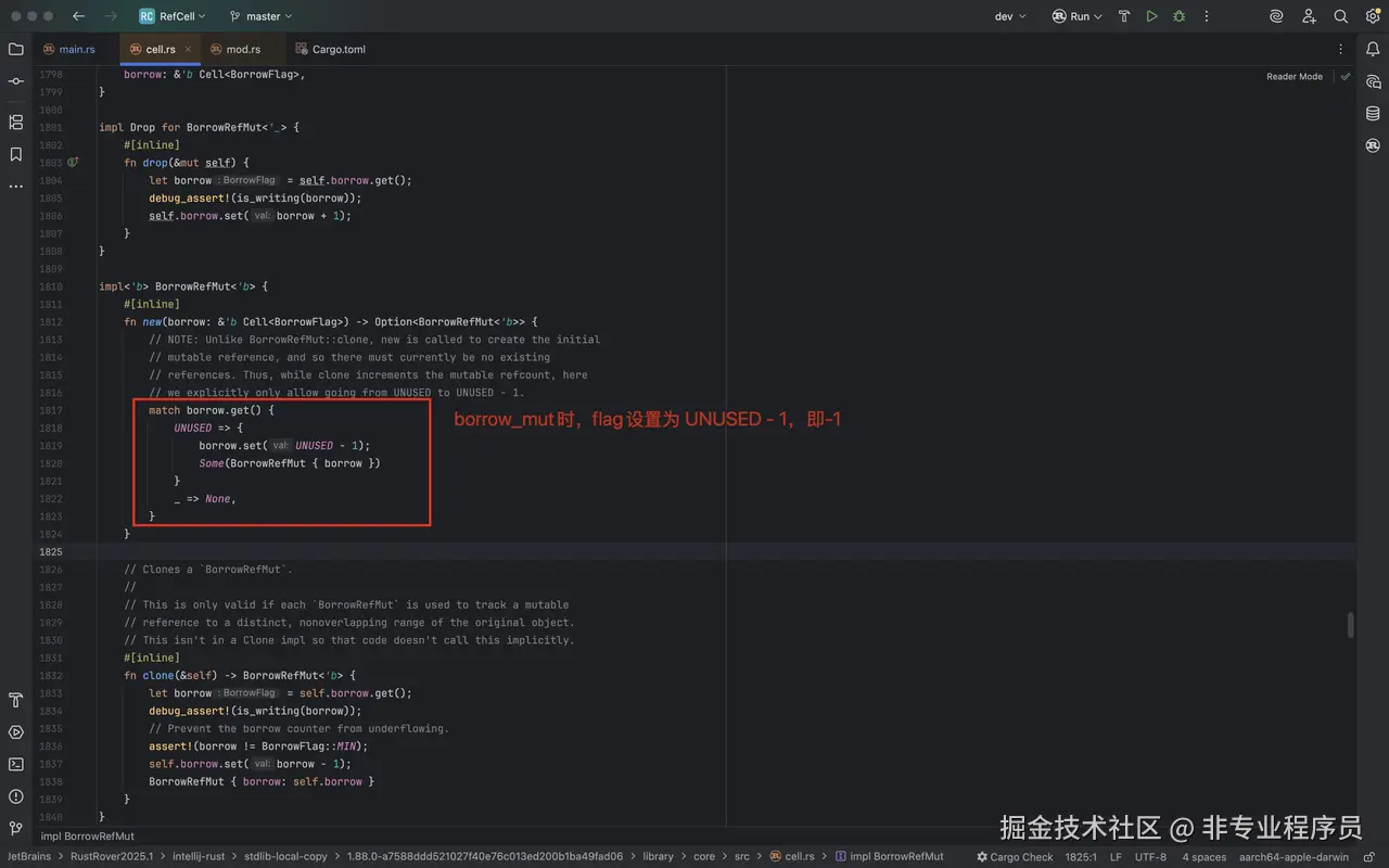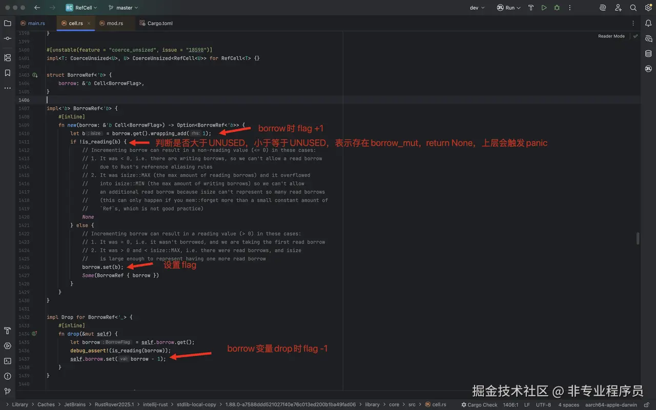 原因在于RefCell borrow() 的底层实现不是原子的 ,看着是多线程读,其实内部存在写操作,变成了隐藏的多线程写,如下: