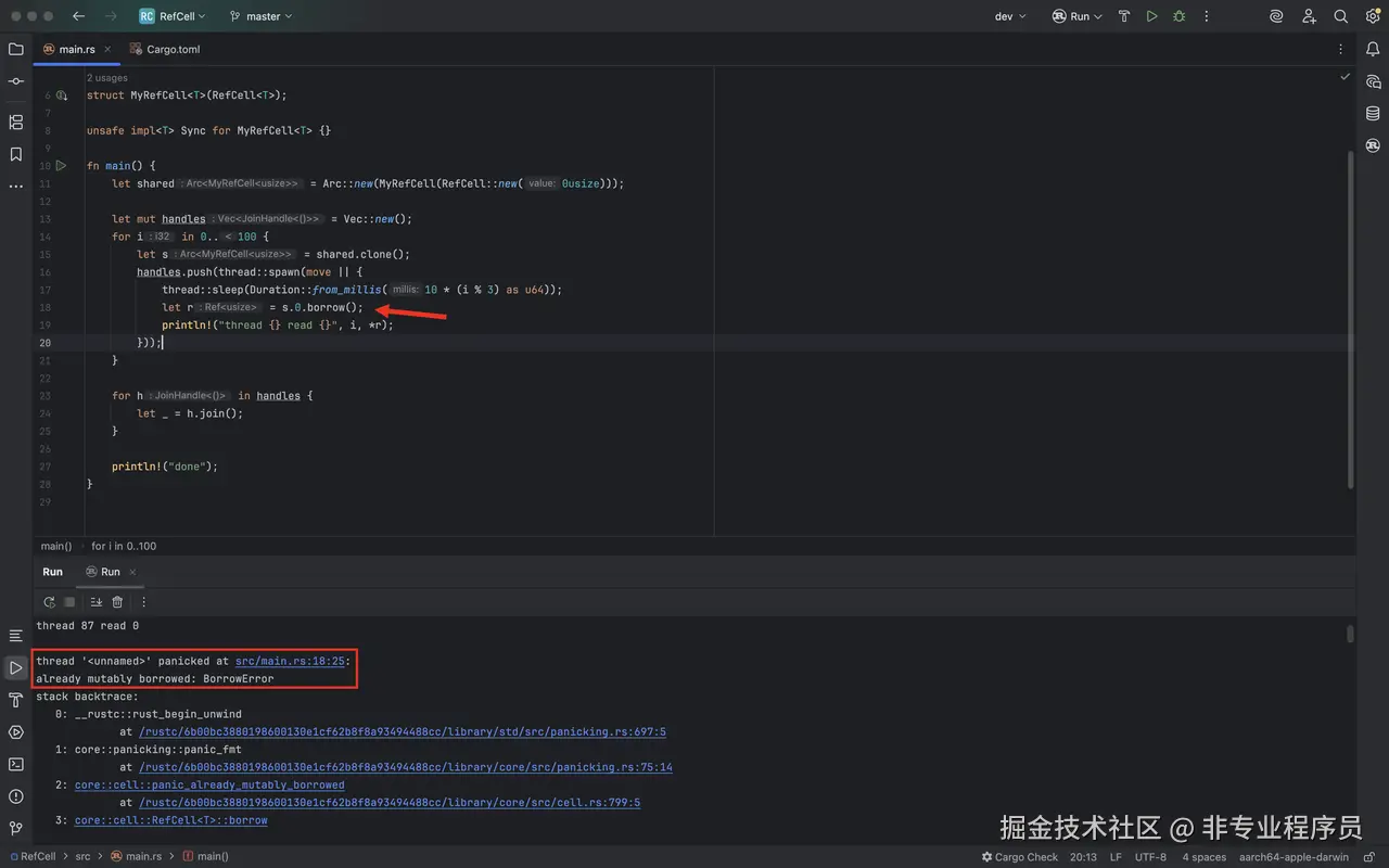 多线程读一个RefCell封装的变量,却发生了panic,原因是: **already mutably borrowed: BorrowError**
