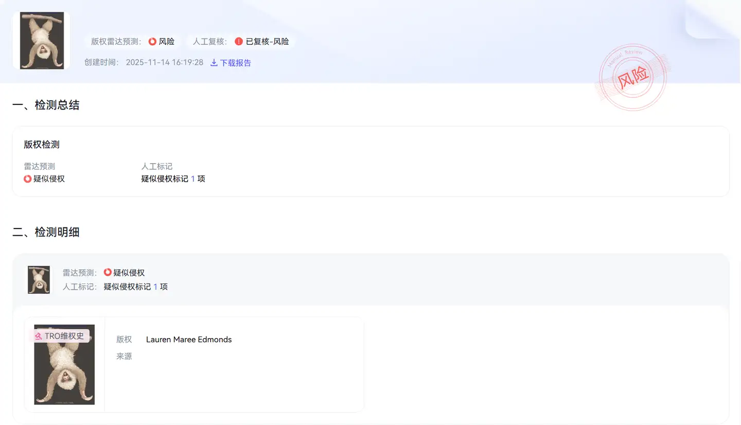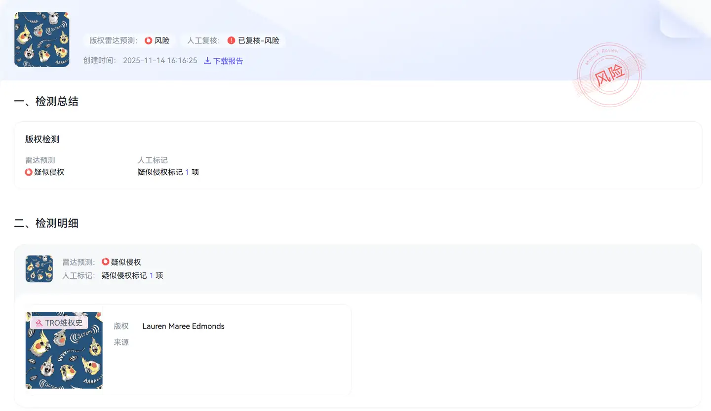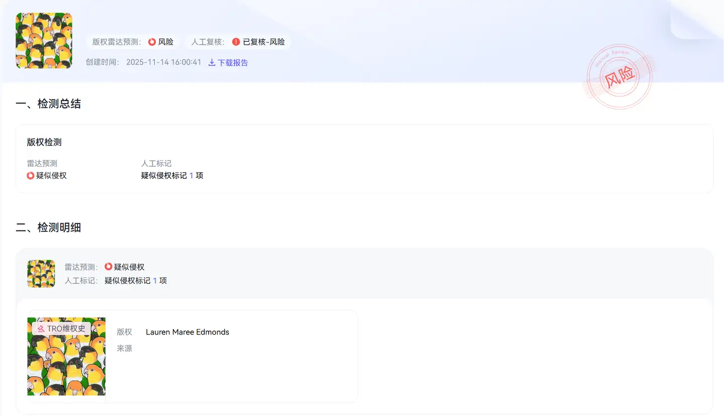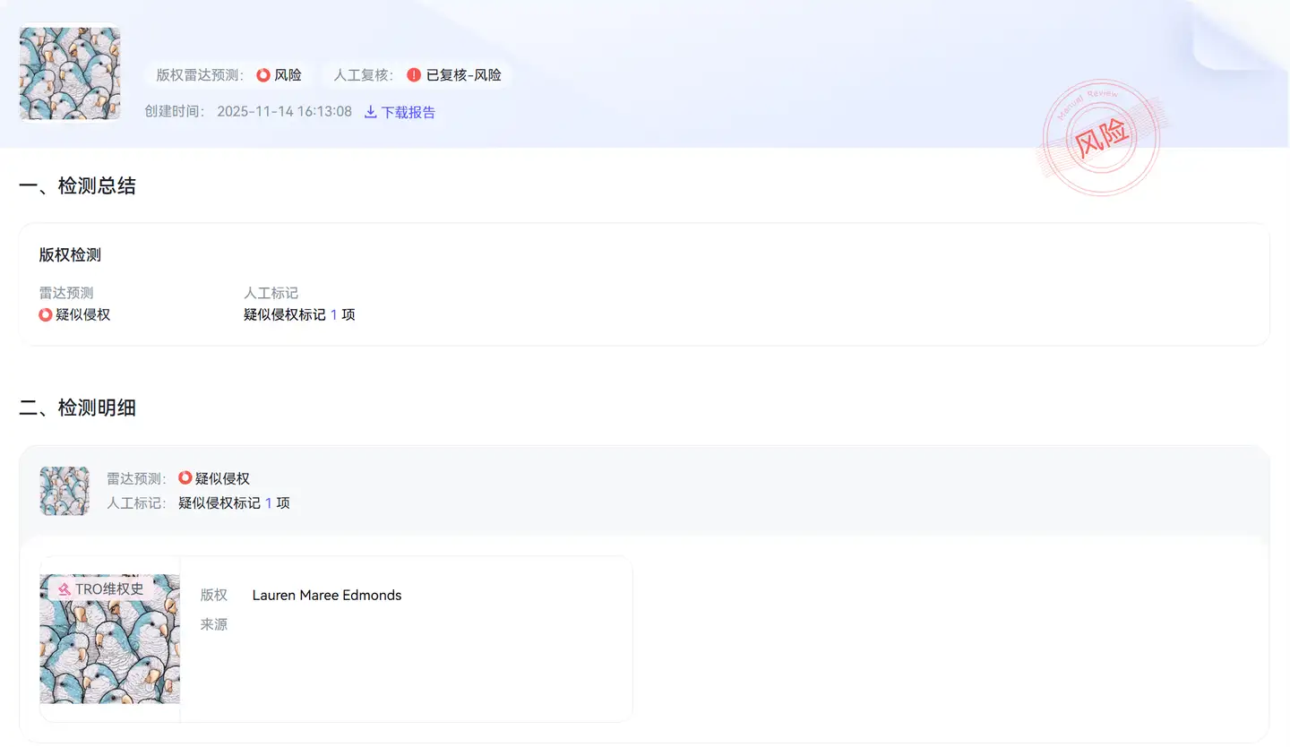 将此次发起维权的图片上传至睿观独家自研的版权检测功能中即可发现,原告Lauren系列作品均已有生效TRO维权史标签。检测结果见下列图片: