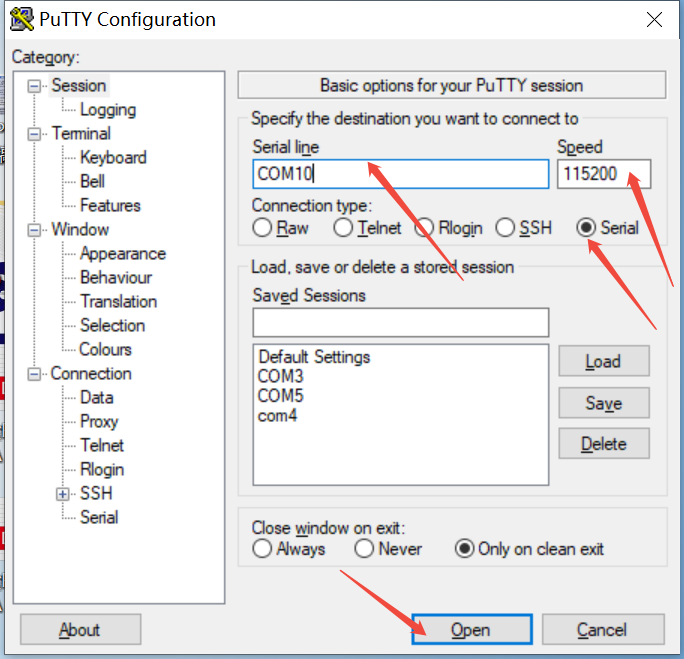 点击Serial设置串口为COM10,波特率设置为115200,停止位设置为1,然后点击Session: