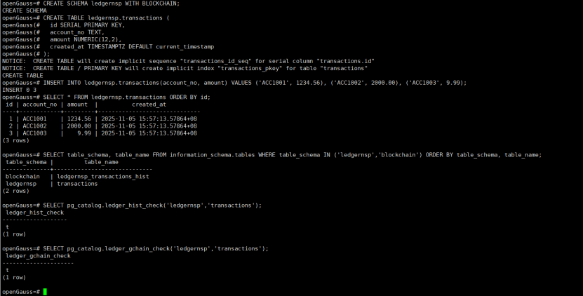 账本(Ledger / 防篡改)功能测试 ------ 创建账本 schema 与表、插入、校验