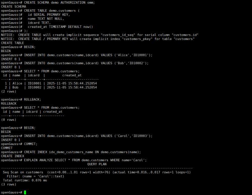 -- (在当前会话中,你可以模拟:SET ROLE app_user; SELECT * FROM demo.customers_public; SET ROLE omm;)