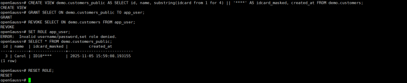 -- 3) 切换到 app_user 会话(在另一个 gsql 会话中用 app_user 登录)可以验证只能看到脱敏列