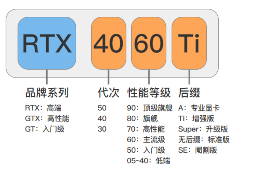 - 我们综合评估下来:4070主机显卡 好过5060; 能买4070,就不要买5060;能买3080就不要买4060; 因为英伟达显卡的命名如下图, 他是前面40,50表示第几代,不是越高越高,仅仅是架构不同;后面的60,70才是性能的高低;