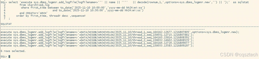 execute sys.dbms_logmnr.add_logfile(logfilename=>'+DATA/HISDB/ARCHIVELOG/2025_11_10/thread_1_seq_164164.12720.1216809077');
