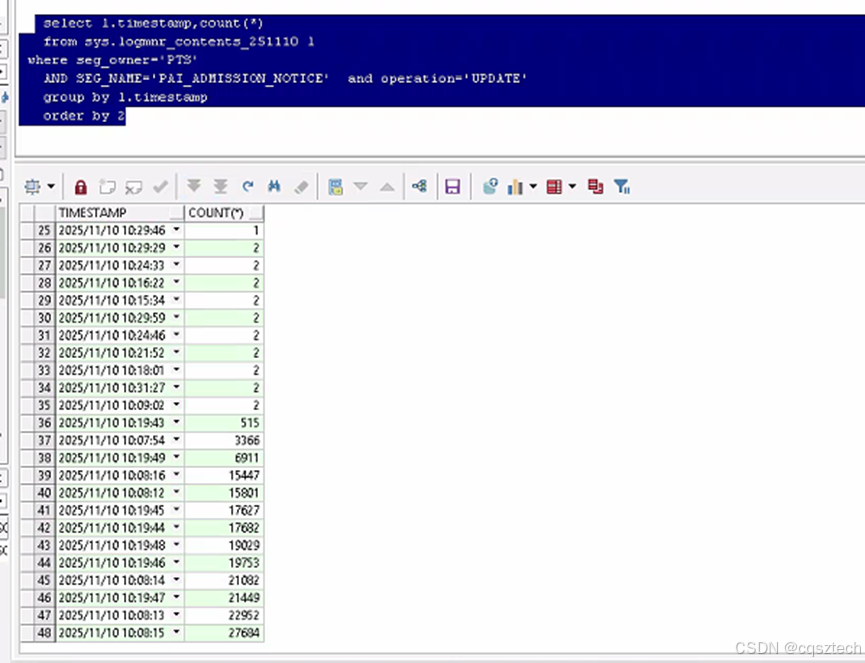 我们可以直接对 vlogmnr_contents 进行分析,但会占用内存,影响系统。一般我们是对 vlogmnr_contents 创建一个表,后面通过其他工具,比如PLSQL DEVELOPER等图形界面工具慢慢分析。