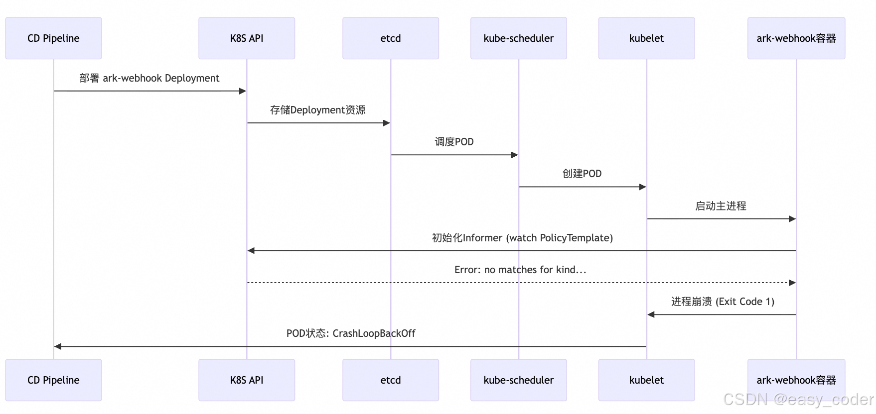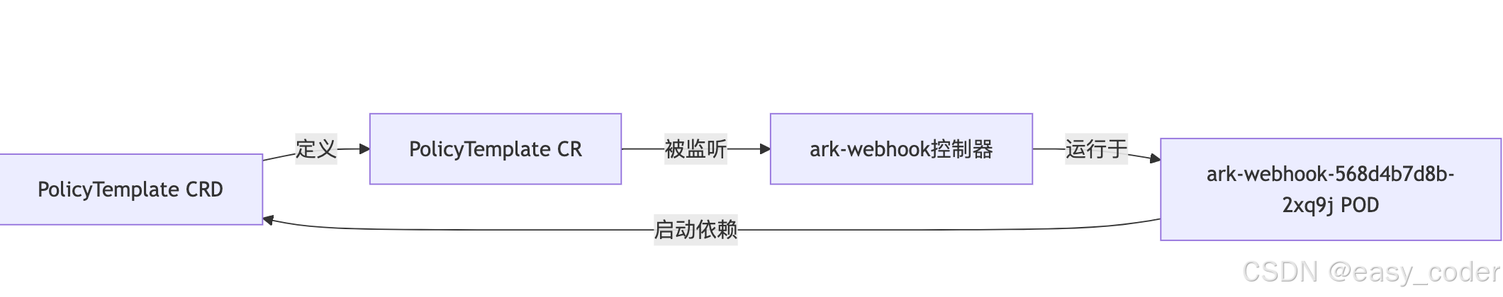 ark-webhook案例中:PolicyTemplateCR定义安全策略规则ark-webhook控制器(运行在POD中)通过Informer机制 监听PolicyTemplateCR- 当CRD缺失时,Informer初始化失败 → 控制器无法启动 → POD因主进程崩溃而失败