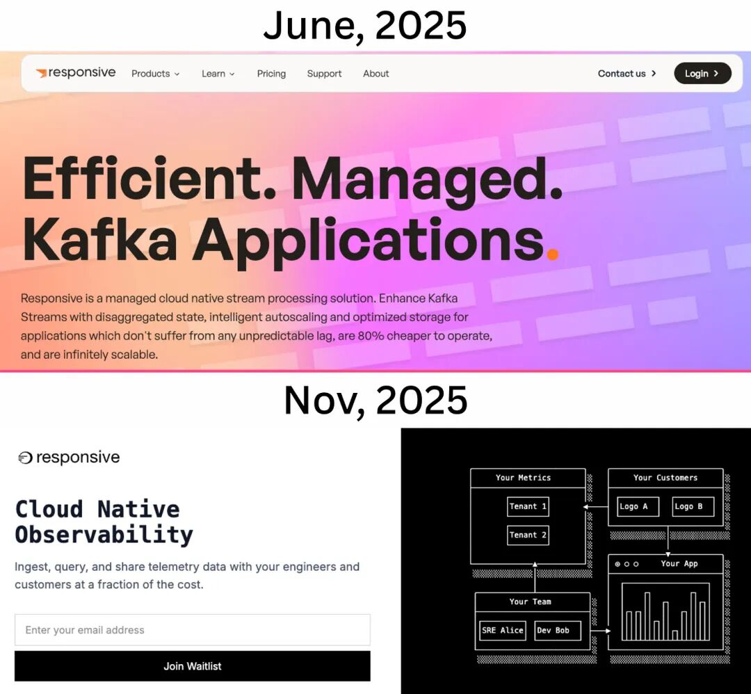 以Responsive.dev为例,这家公司由 Confluent 的顶尖前人才创立并运营。8它是一家专注于 Kafka Streams 的精品创业公司,致力于提升流媒体应用的可靠性和可扩展性。但最近,它彻底转型,放弃了流媒体业务,转而专注于可观测性领域。