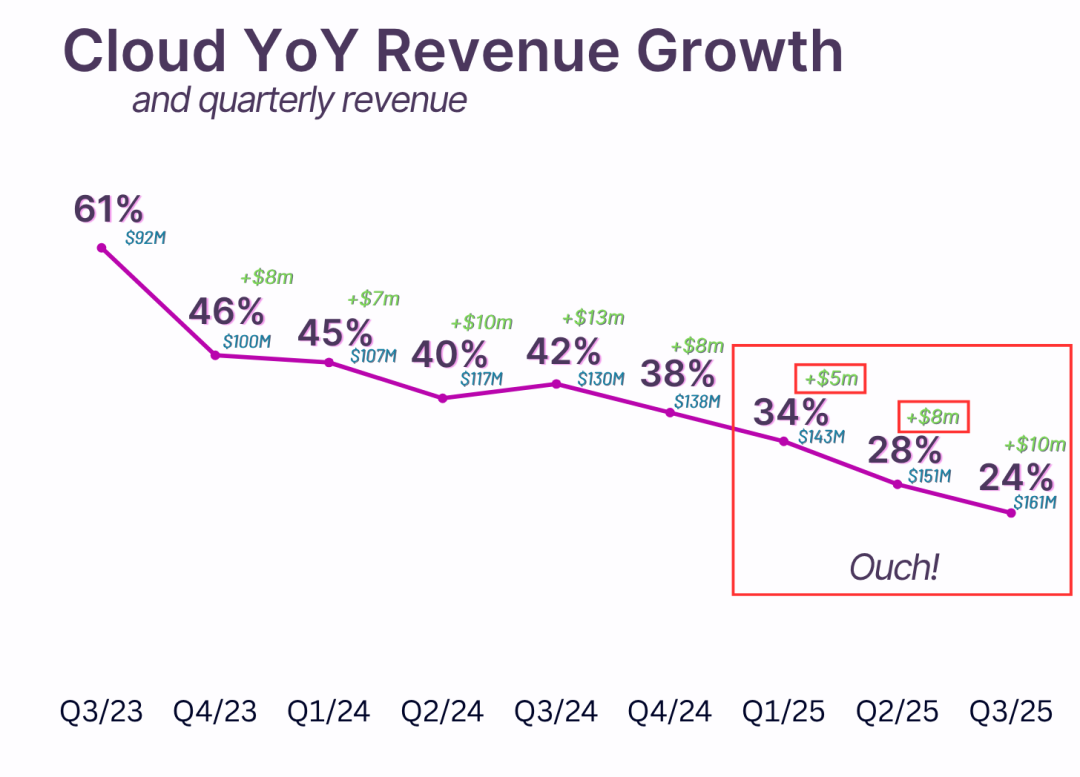 Confluent的增长已接近顶峰。他们曾经快速增长的明星产品------云计算产品,如今增长速度正在迅速放缓。