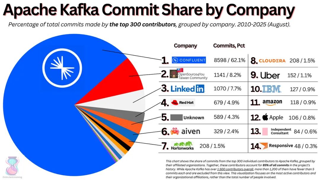 对 2010 年至 2025 年间 85% 以上的 Apache Kafka 开源贡献进行分析。