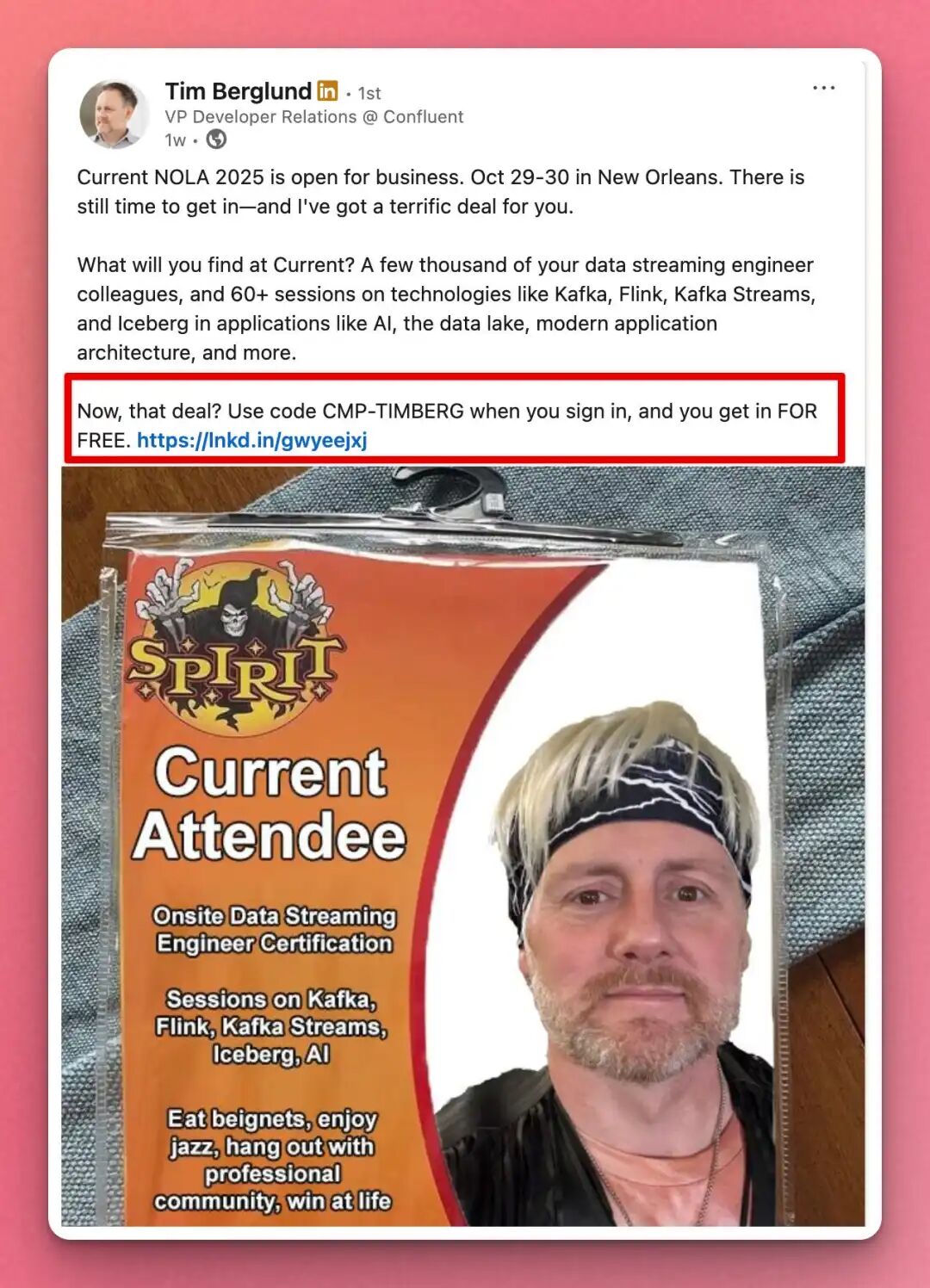 - 在旗舰大会(2025年10月,新奥尔良)召开前26天, Confluent被发现在社交媒体上免费发放 门票。一张价值500-1000美元的门票,竟然在大会召开前整整一个月就开始免费发放。这说明了什么?
