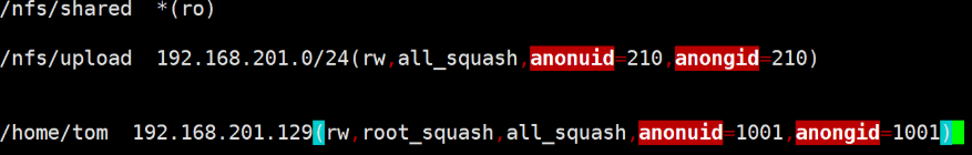 二、开放/nfs/upload目录,为192.168.xxx.0/24网段主机可以上传目录,并将所有用户及所属的组映射为nfs-upload,其UID和GID均为210