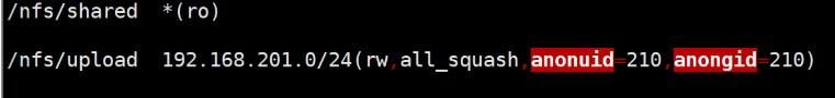 并将所有用户及所属的组映射为nfs-upload,其UID和GID均为210