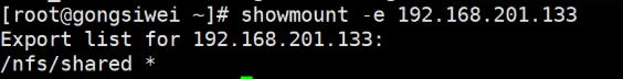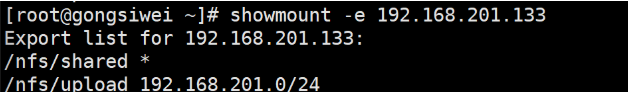 2.查询 nfs 服务器导出的共享目录列表 [root@gongsiwei ~]# showmount -e 192.168.201.133