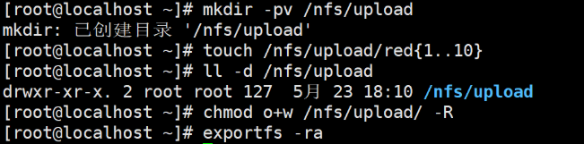 5.[root@localhost ~]# exportfs -ra (使 /etc/exports 文件中的最新配置生效,无需重启 NFS 服务。客户端的挂载不会断开,仍可继续访问共享目录。)
