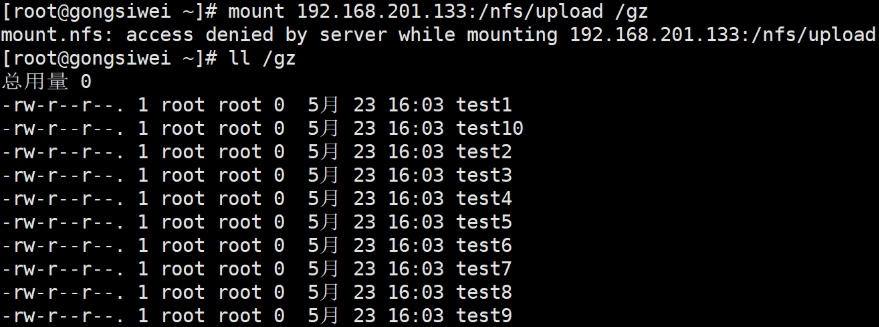 3.将 /nfs/upload 文件挂载到 /gz 目录并查看共享目录下是否有服务端共享的文件 (挂载之前我们先要取消前面挂载到 /gz目录下的 /nfs/shared 文件共享目录)