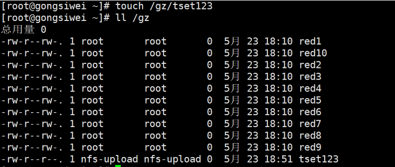 3.创建测试文件和查看目录权限,确保所有用户可读 /nfs/shared 路径下文件