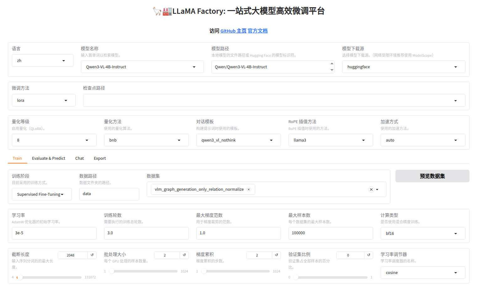 - 首先使用LLaMA Factory,对Qwen3-VL-4b进行Lora监督微调,得到微调后的lora权重;