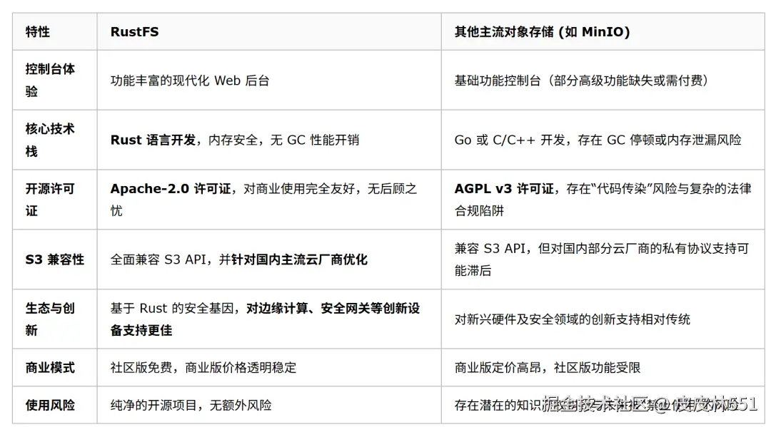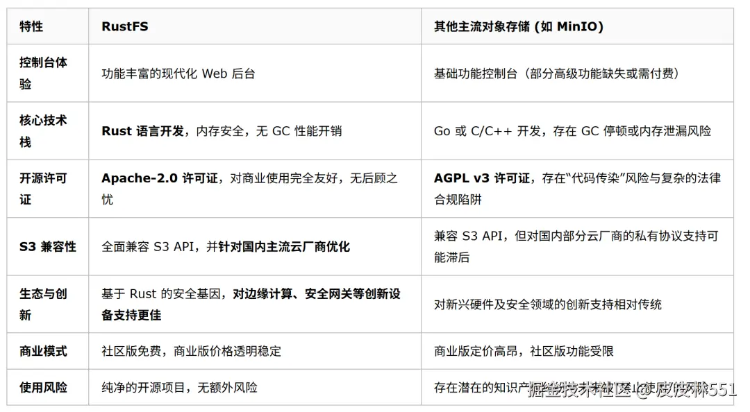 在这样的背景下,RustFS 应运而生。它不仅是一个雄心勃勃的 MinIO 开源平替,更代表了一条坚持自主可控的技术路线 。为了更直观地展示 RustFS 的价值。