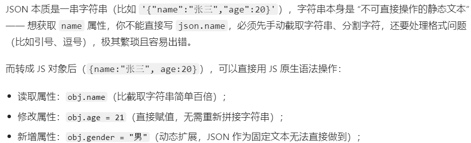 | Web 开发 | 用户名、年龄 | JSON.stringify/parse | AJAX(邮局) | 直接把 JSON 文字交给邮局,邮局收 |