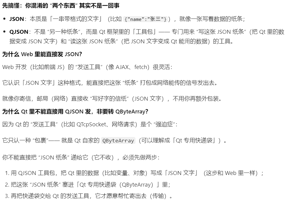 | Qt 开发 | 用户名、年龄 | QJSON 工具包 | Qt 网络模块(挑剔快递员) | 先把 JSON 文字装进 QByteArray 快递袋,再给快递员 |