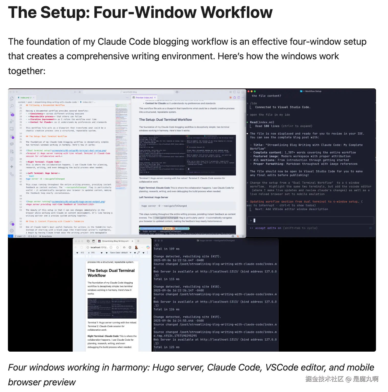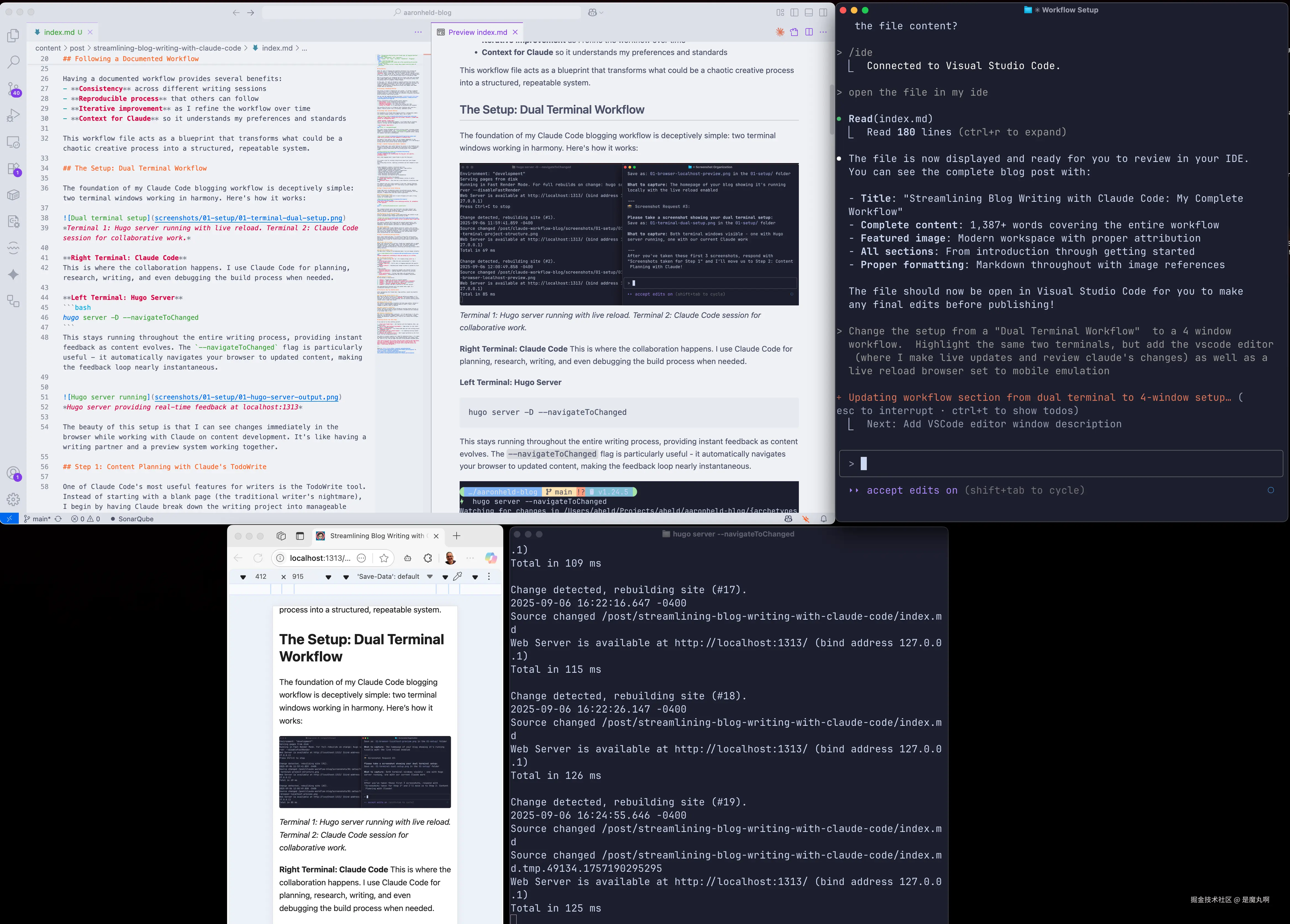 这个四窗口设置的美妙之处在于完整的反馈循环:Claude生成内容,我在VSCode中审查,Hugo立即重建,我可以立即看到桌面和移动演示。这就像拥有一个完整的编辑和设计团队完美同步工作。