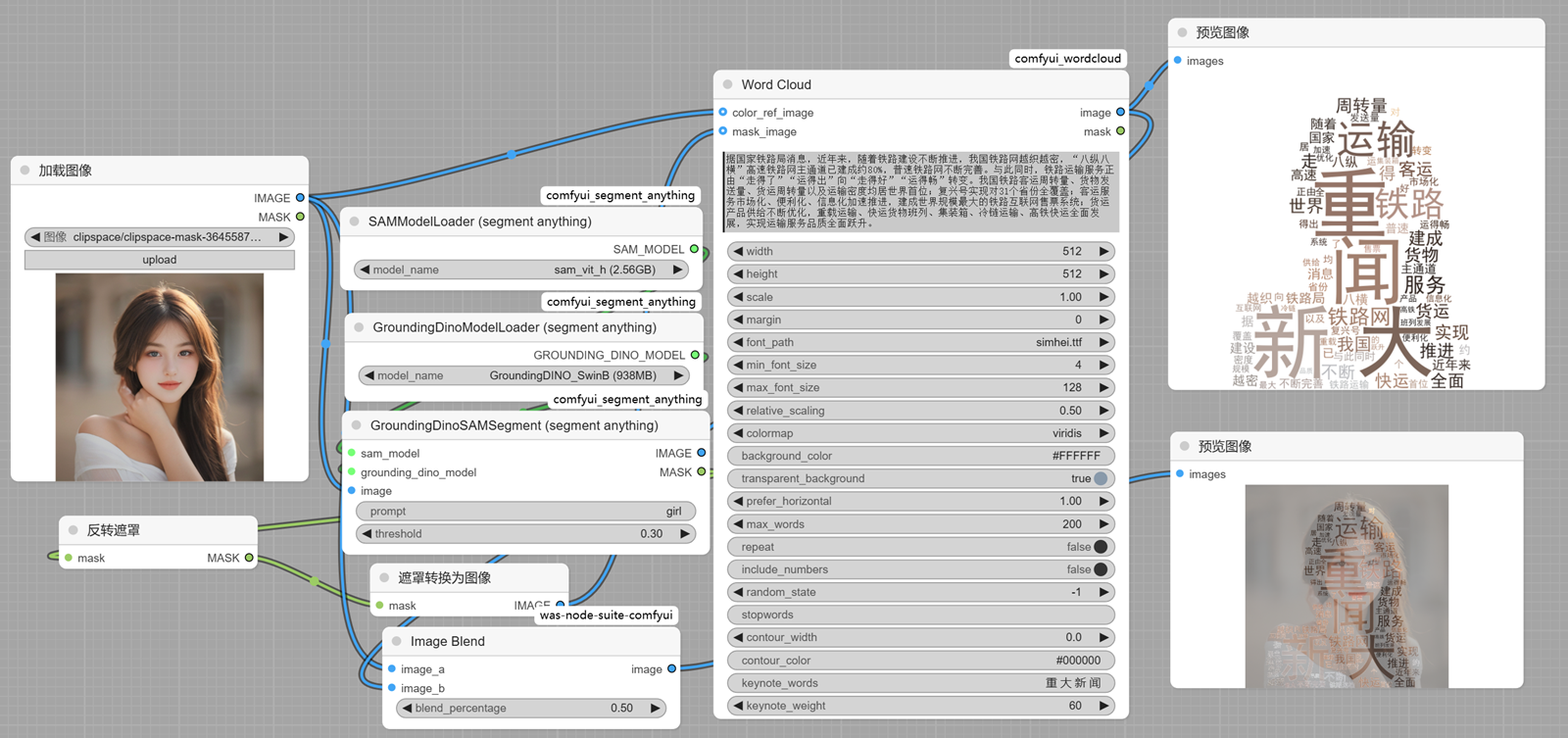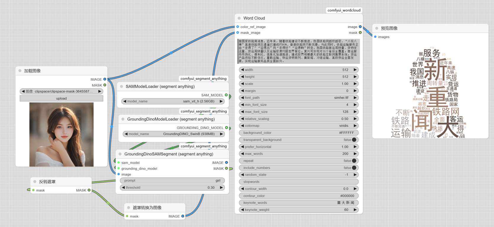 我们利用Segment 进行内容提取,这里的节点可以利用Segement节点提取当前的图片中的图片内容,然后结合WordCloud 节点生产字云效果。
