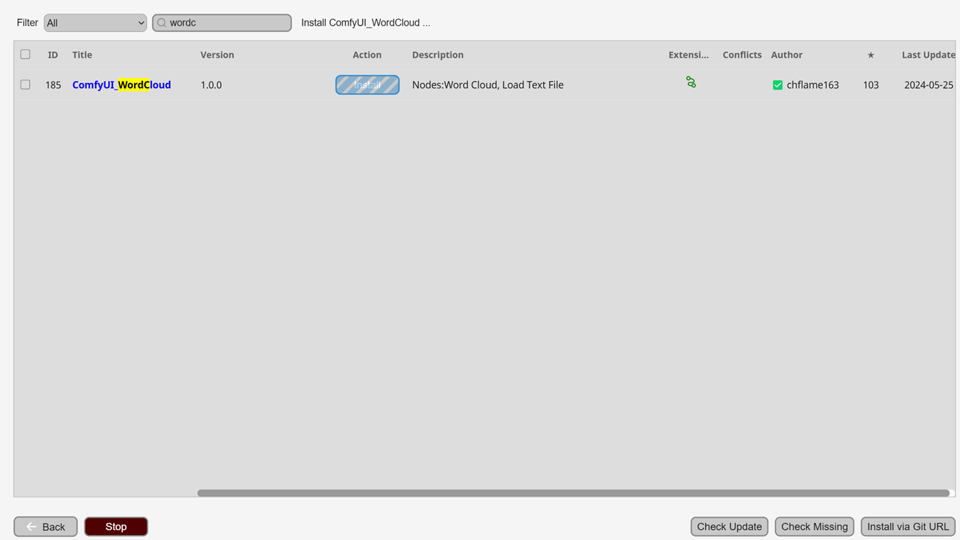 WordCloud 节点不需要特别的额外的模型,我们只需要在这里搜索Word 即可完成节点安装。