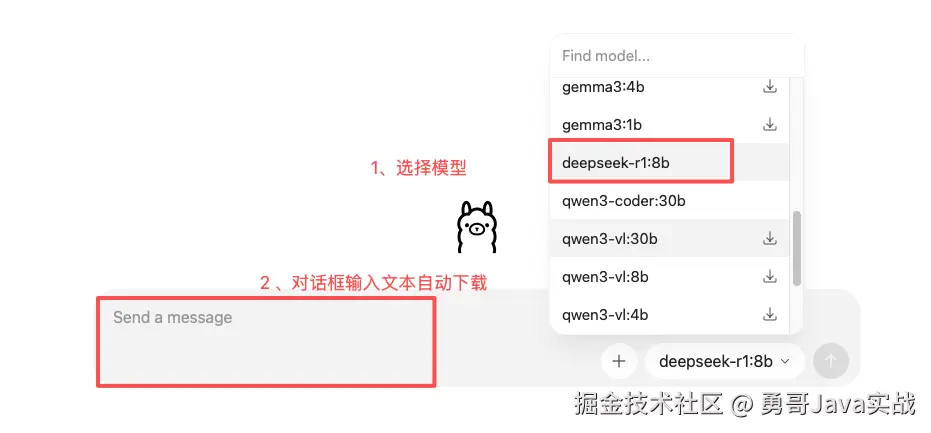 在 GUI 界面选择模型 ,若未下载会显示下载图标,然后在对话框中输入任意文本即可自动下载。