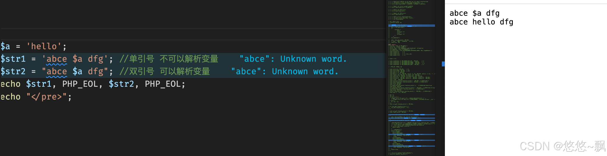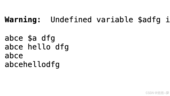 php$a = 'hello'; $str1 = 'abce $a dfg'; //单引号 不可以解析变量 $str2 = "abce $a dfg"; //双引号 可以解析变量 $str3 = "abce$adfg"; //难以区分Warning: Undefined variable $adfg i $str4 = "abce{$a}dfg"; //大括号可以解析变量 echo $str1, PHP_EOL, $str2, PHP_EOL, $str3, PHP_EOL, $str4, PHP_EOL; -