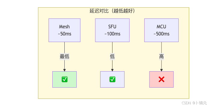 - 无需服务器中转媒体流(只需信令服务器),延迟最低。