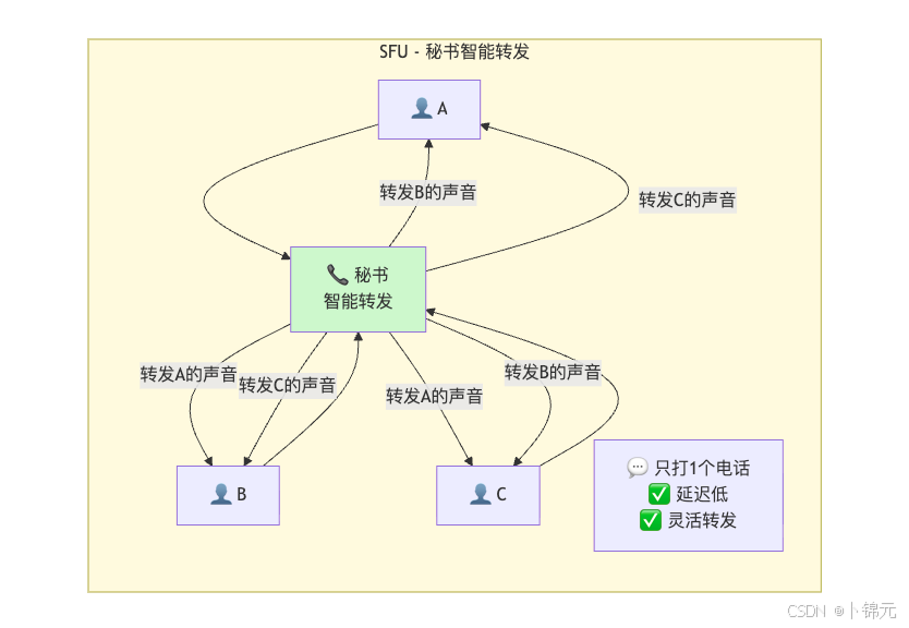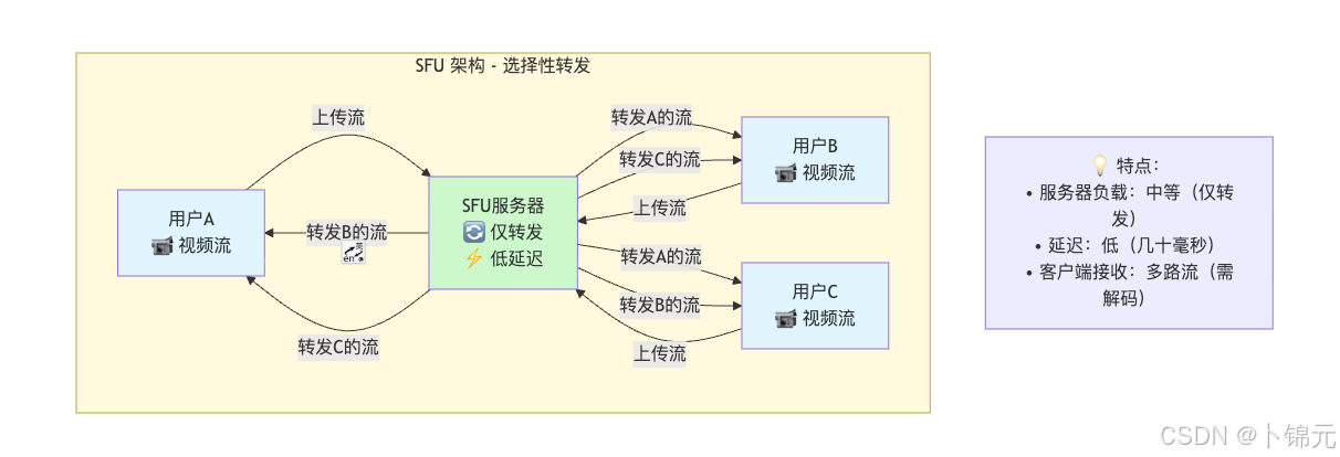 | SFU | Selective Forwarding Unit | 服务器只转发数据,不转码、不混流 | 上行到 SFU,SFU 选择性转发 | 低延迟、高效率,当前主流架构(如 mediasoup) |