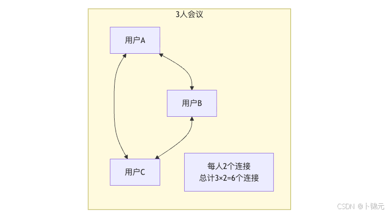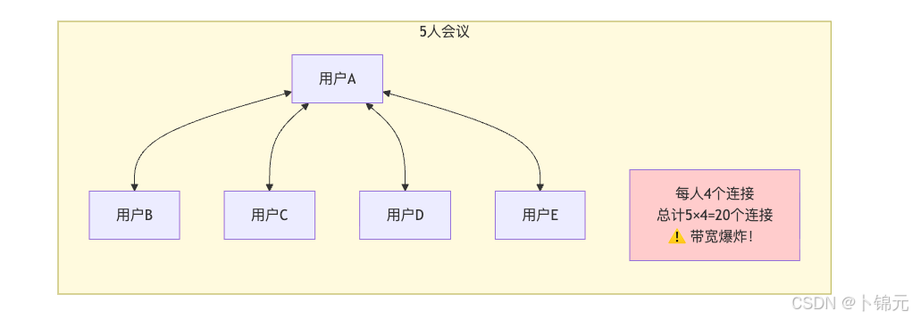 ➡ 三人会议时,每人都要维持 2 个连接;五人会议时,每人要维持 4 个连接;N 人会议则需要 N-1 个连接。