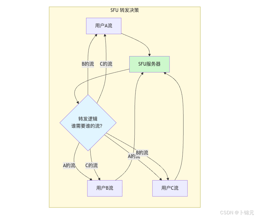 每个客户端只需上传一路音视频流,由 SFU 决定哪些人需要收到这路流。