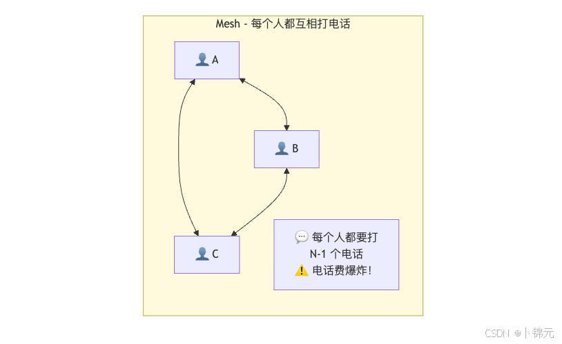 在音视频实时通信系统(RTC)或会议系统的设计中,理解 Mesh、MCU、SFU 三种媒体服务架构是构建系统的基础。它们代表了三种不同的媒体流传输与处理策略,对性能、延迟、服务器负载、带宽成本都有直接影响。