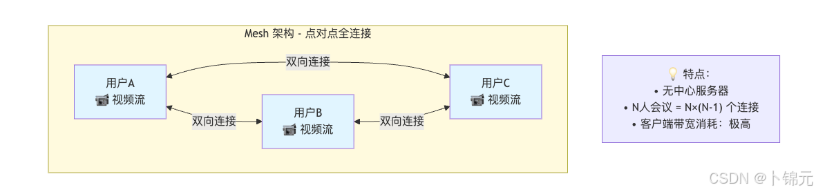 | Mesh | Peer-to-Peer Mesh Network | 每个客户端与其他客户端直接建立连接,互相发送/接收流 | 全连接(N×N) | 简单无服务器,但扩展性极差 |