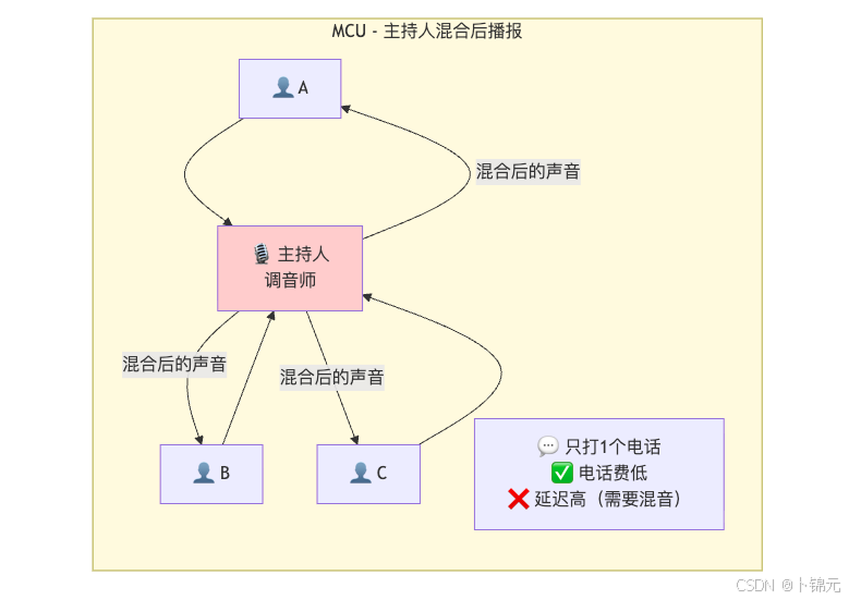 MCU 接收所有人的音视频流 → 解码、混合、再编码 → 发送一条混合后的音视频流给每个客户端。