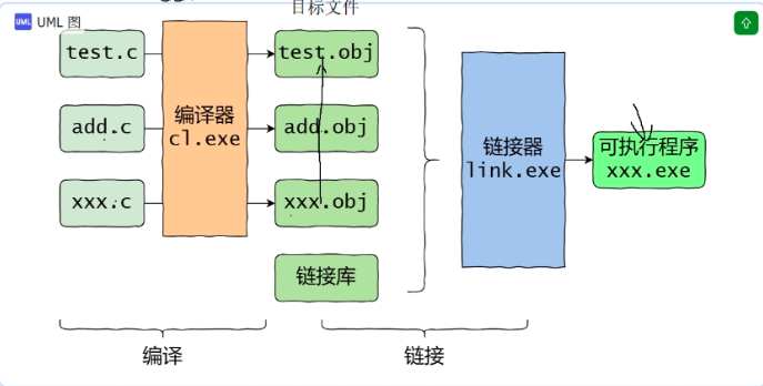 多个目标文件和库文件经过链接器处理生成对应的可执行程序(.exe文件)
