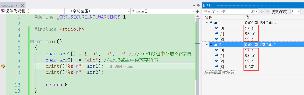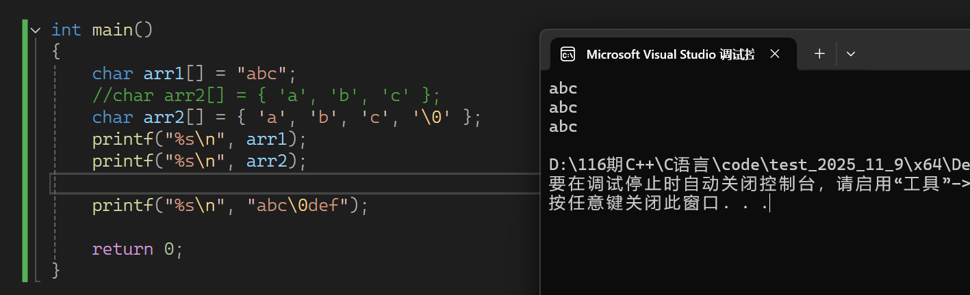 char arr2[] = "abc"; //arr2数组中存放字符串
