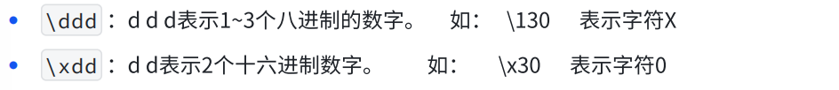 下面两种特殊的转义字符可以理解为字符的 8 进制或者 16 进制表示。