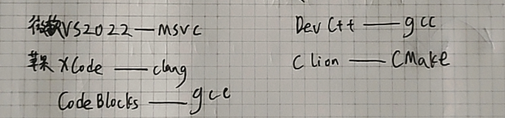 比如:msvc、clang、gcc 就是一些常见的编译器,VS2022、XCode、DevC++、Clion......一些常见的集成开发环境。