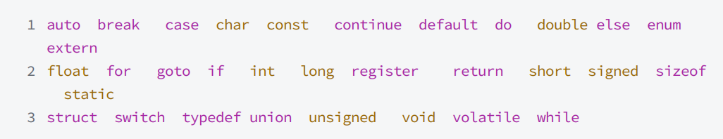 注:在C99标准中加入了 inline、restrict、_Bool、_Complex、_Imaginary 等关键字。
