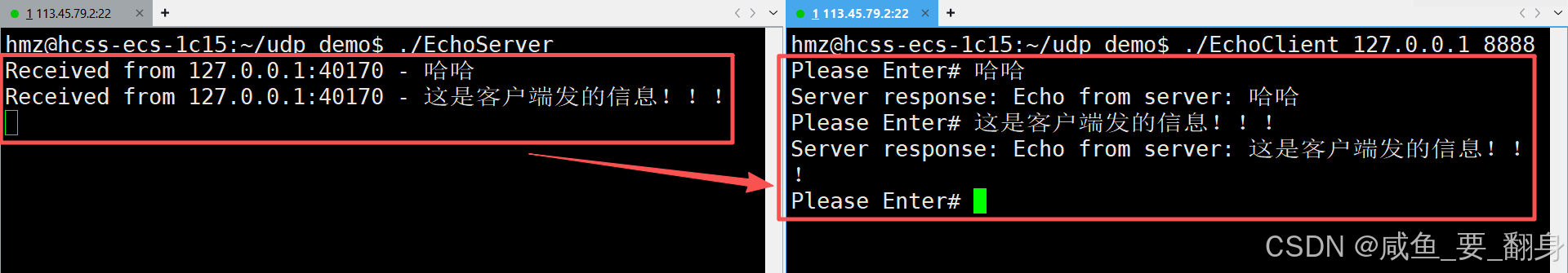 首先需要先启动对应端口的Echo服务器,也就是编译和运行服务端,然后对客户端进行同样的操作,然后测试回声服务器时,服务端和客户端都能观察到相应现象,从而可以准确判断通信状态,如下: