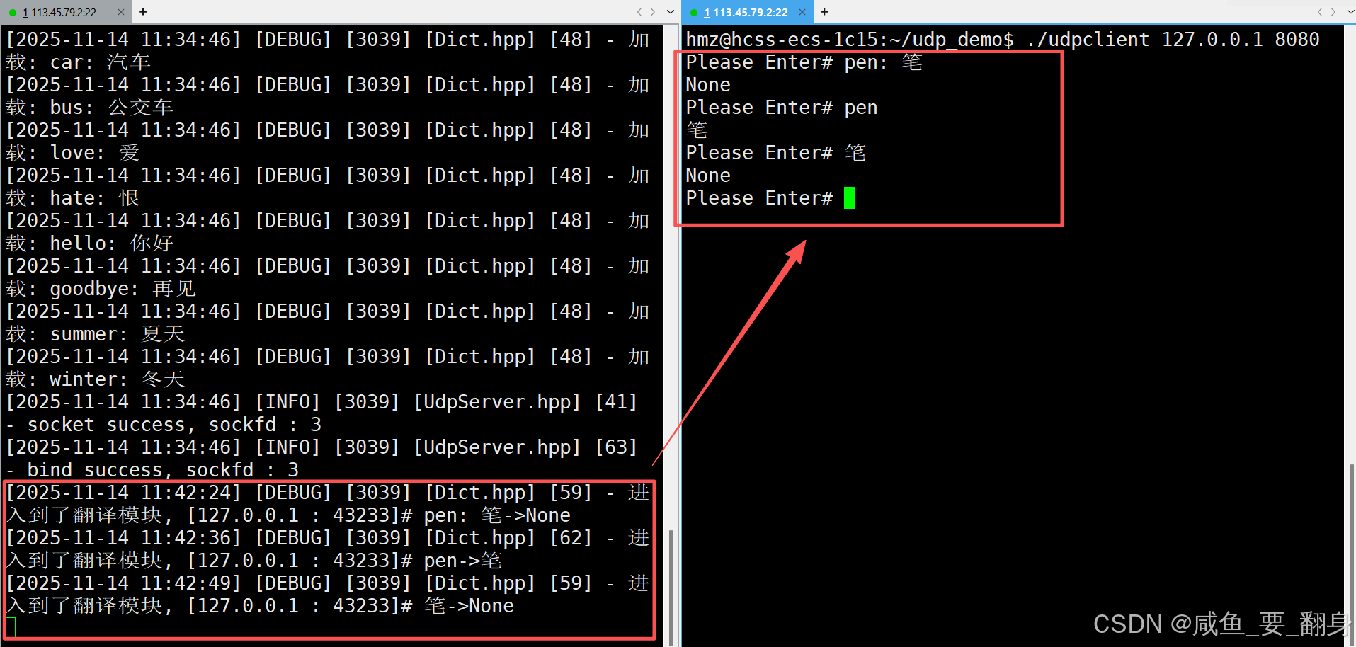 此时我们使用客户端给服务端发送用户要求翻译的单词(下面举例了三种情况(只有第二个才是正确的),也就是说只能英译中,不能中译英,否则就会输出None),回车后然后可以看到服务端给客户端回显一条对应的翻译信息,同时服务端也记录着日志信息: