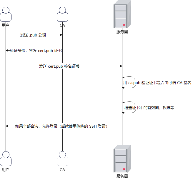 (补充)上图说的后续使用传统的 SSH 登录 ,这里不是说服务器存了用户的公钥,而是用户的公钥已经包含在证书里面,服务器解析证书的时候就已经知道了公钥信息,然后用公钥信息加密数据再给用户回复过去,基本流程相同,不同的就是服务器不存放用户的公钥