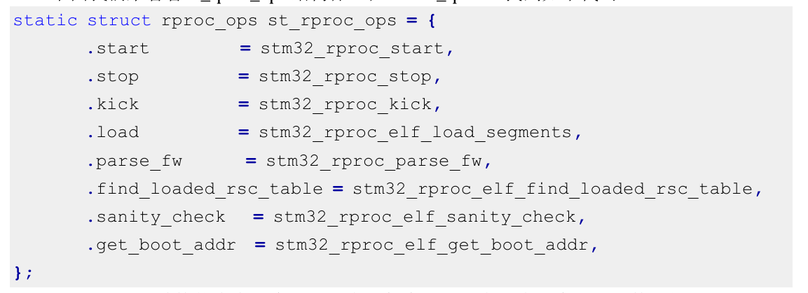 st_rproc_ops 结构体中有几个处理程序,每个处理程序对应一个回调函数,如 start 处理程序接受一个 rproc 结构体,然后打开设备电源并启动它。stop处理程序采用 rproc 并关闭远程处理器。kick处理程序接受一个 rproc 和一个放置新消息的虚拟队列的索引,调用此函数时会中断远程处理器并让它知道它有待处理的消息。find_loaded_rsc_table就是查找已经加载的固件资源表,执行的是stm32_rproc_elf_find_loaded_rsc_table()函数。 每个 Remoteproc 的实现至少应该提供 start 和 stop 处理程序,关于这些函数我们不必深入分析,只要我们知道这是ST官方实现操作M4相关的接口函数就行了。