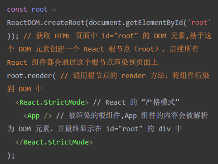 import App from './App'; // 导入根组件const root = ReactDOM.createRoot(document.getElementById('root')); // 获取 HTML 页面中 id="root" 的 DOM 元素,基于这个 DOM 元素创建一个 React 根节点(root),后续所有 React 组件都会通过这个根节点渲染到页面上